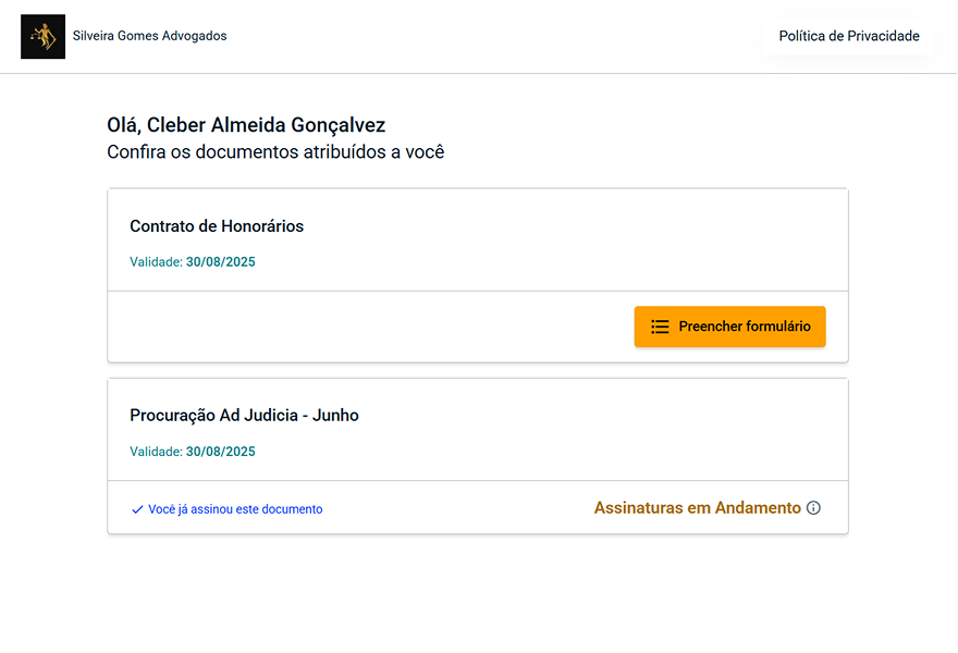 Experiência white-label para signatários, com a identidade visual do escritório, e informações personalizadas, como políticas e instruções, aumentando a confiança no processo de assinatura.